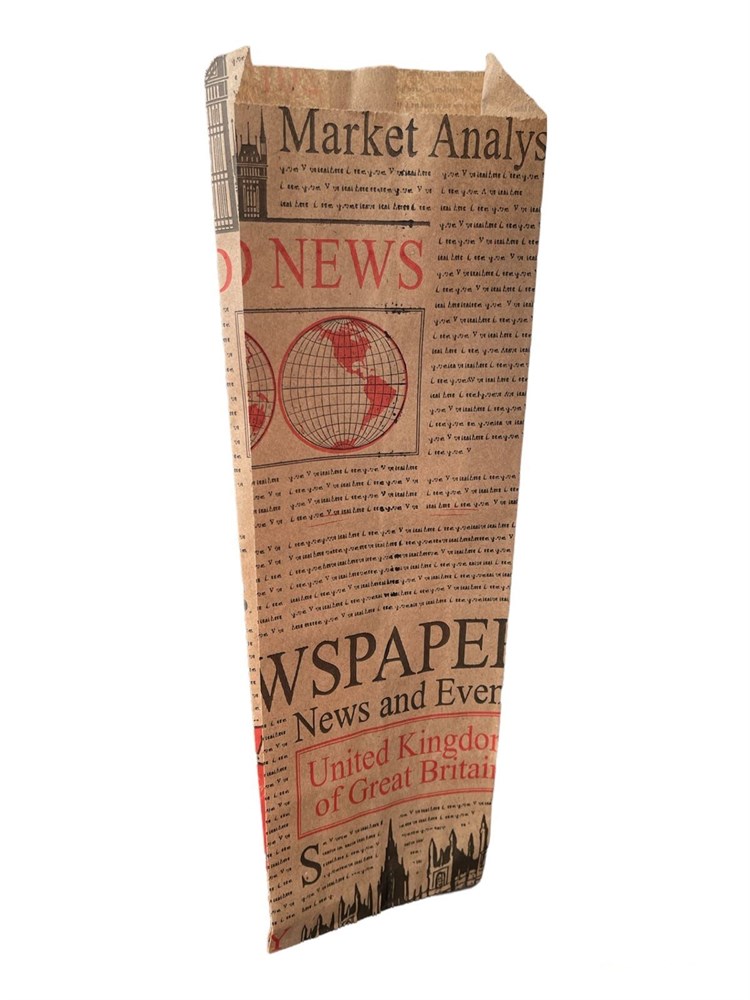 Бумажный пакет 90*40*300 мм с рисунком «Газета Лондон» крафт /100/1500/ СГ