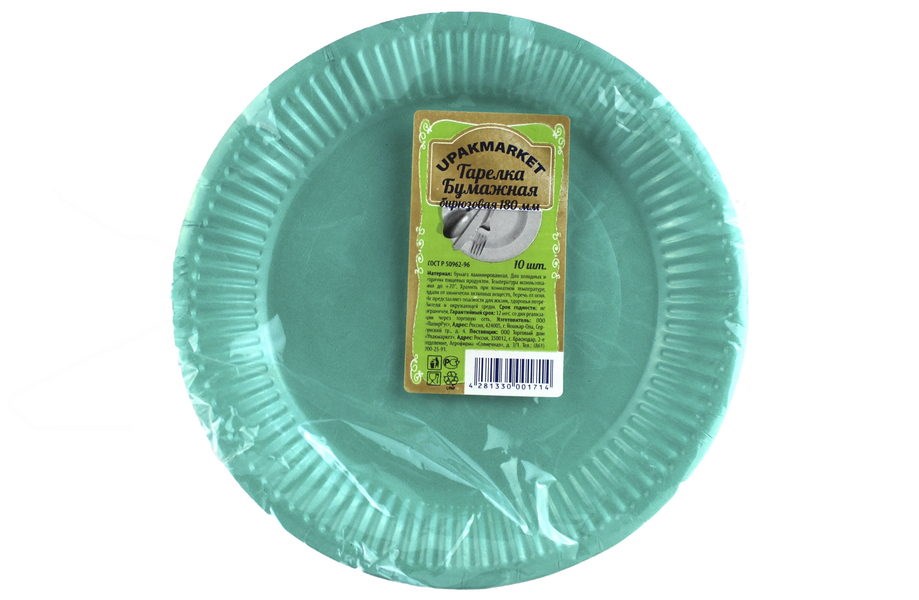 Тарелка бумужная 180мм Бирюзовая 10шт. Миксы (60шт/кор.) изготовлены из материала, который не выделяет вредных веществ.