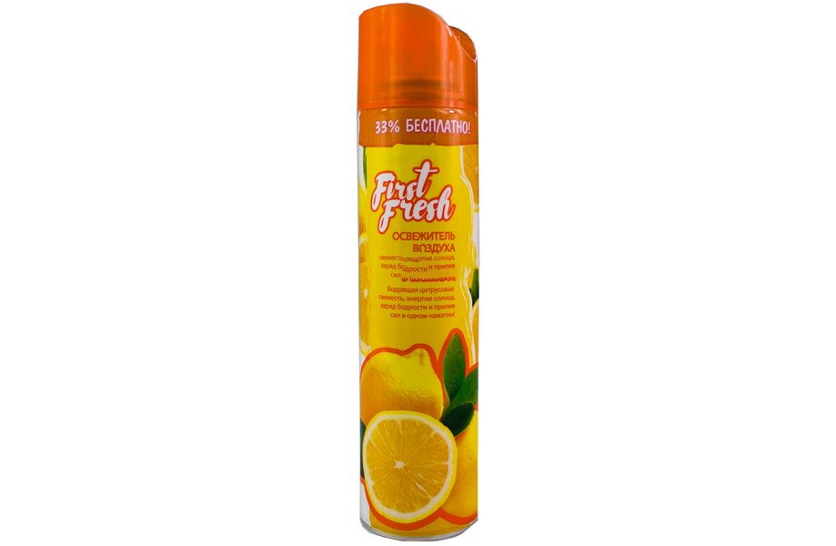 Освежитель воздуха First Fresh «Лимон» предназначен для устранения неприятных запахов в различных помещениях. Обладает длительным действием, надолго наполняя помещение неповторимым тонким ароматом. Не содержит озоноразрушающих веществ.